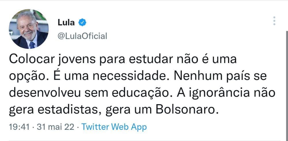 Em um de seus vários tweets postados diariamente contra a forma que o atual presidente conduz o país, -candidato à presidência do Brasil, Luiz Inácio Lula da Silva, do Partido dos Trabalhadores (PT), escreveu: “colocar jovens para estudar não é uma opção. É uma necessidade. Nenhum país se desenvolveu sem educação. A ignorância não fera estadistas, gera um Bolsonaro”.