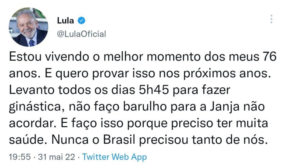 “Estou vivendo o melhor dos meus 76 anos. E quero provar isso nos próximos anos. Levanto as 5h45 para fazer ginástica, não faço barulho para a Janja não acordar. E faço isso porque preciso ter muita saúde. Nunca o Brasil precisou tanto de nós”, escreveu Lula, nesta terça-feira, 31.