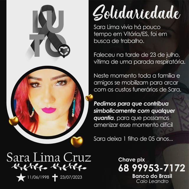 Familiares e amigos pedem ajuda para transladar o corpo até Rio Branco. O custo é estimado em R$ 25.000,00. Quem puder ajudar, o PIX à disposição está no telefone 68 99953-7172, no Banco do Brasil, em nome de Caio Leandro Cavalcante, ex-marido de Sara e pai de seu filho de 5 anos.