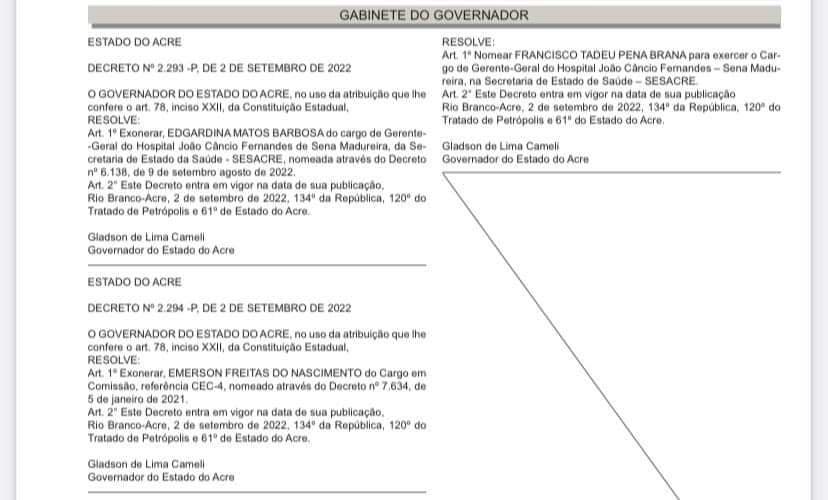 O governo do Estado publicou no Diário Oficial, desta terça-feira, 6, a exoneração da gerente-geral do Hospital João Câncio Fernandes, de Sena Madureira (AC), Edigardina Matos.