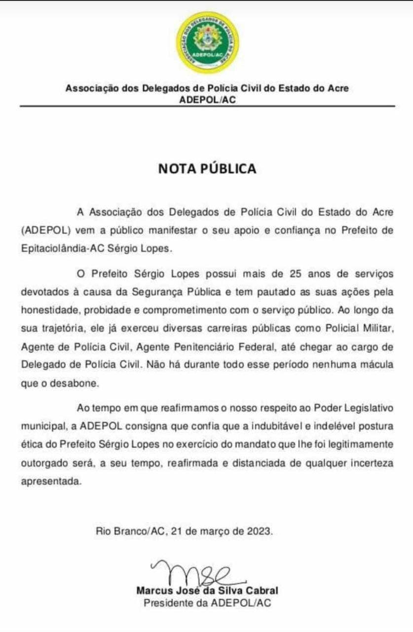 A Associação dos Delegados de Polícia Civil do Estado do Acre (ADEPOL) vem a público manifestar o seu apoio e confiança no Prefeito de Epitaciolândia-AC Sérgio Lopes.