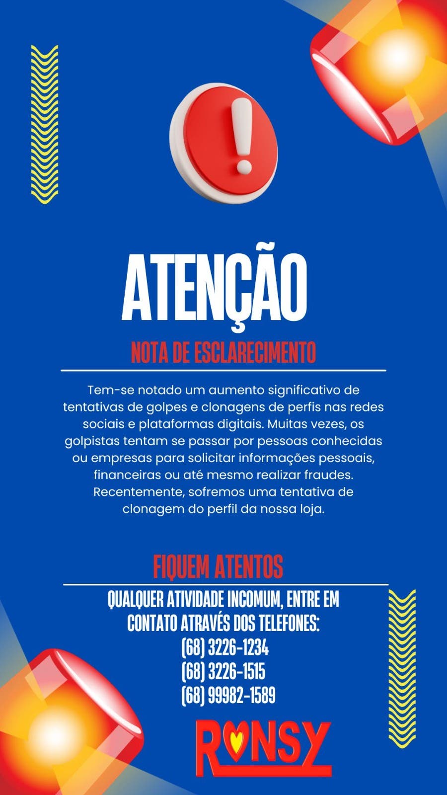 A Ronsy Materiais de Construção já registrou um Boletim de Ocorrência e alerta seus clientes para que redobrem a atenção ao realizar compras online, informando ainda que o número oficial de vendas da loja por celular é (68) 99982-1589, além dos fixos (68) 3226-1234 e (68) 3226-1515.
