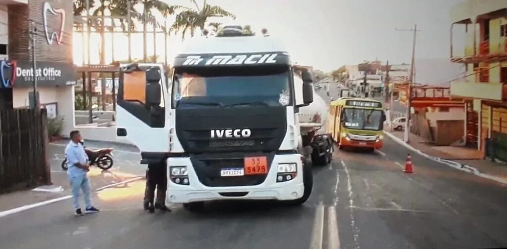 Uma carreta Volvo do tipo Julieta, com dois tanques contendo 40 toneladas de combustíveis, parou parte do trânsito na zona central no início da manhã desta sexta-feira, 30.
