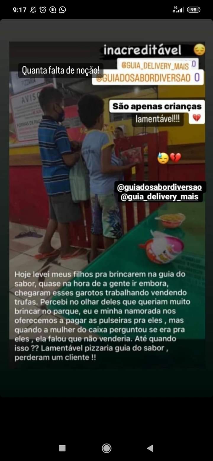 Na publicação, onde o restaurante marcado é o Guia do Sabor, o relato é que as crianças entraram no estabelecimento oferecendo trufas aos clientes e ficaram olhando para os brinquedos.