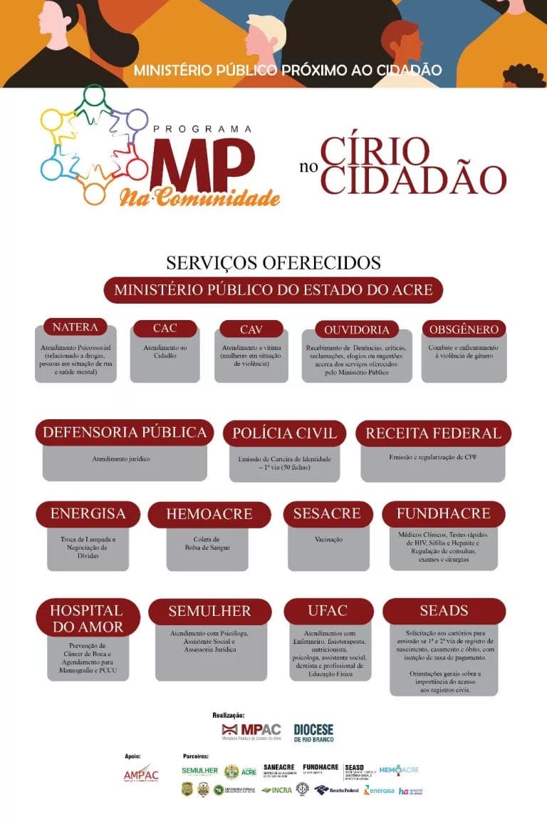 No sábado, dia 23, ocorrerá o Círio Social como uma das atividades do Círio de Nazaré em Rio Branco. A Diocese de Rio Branco e o Ministério Público estão trabalhando juntos em um projeto chamado MP na Comunidade, com a participação de outras organizações.