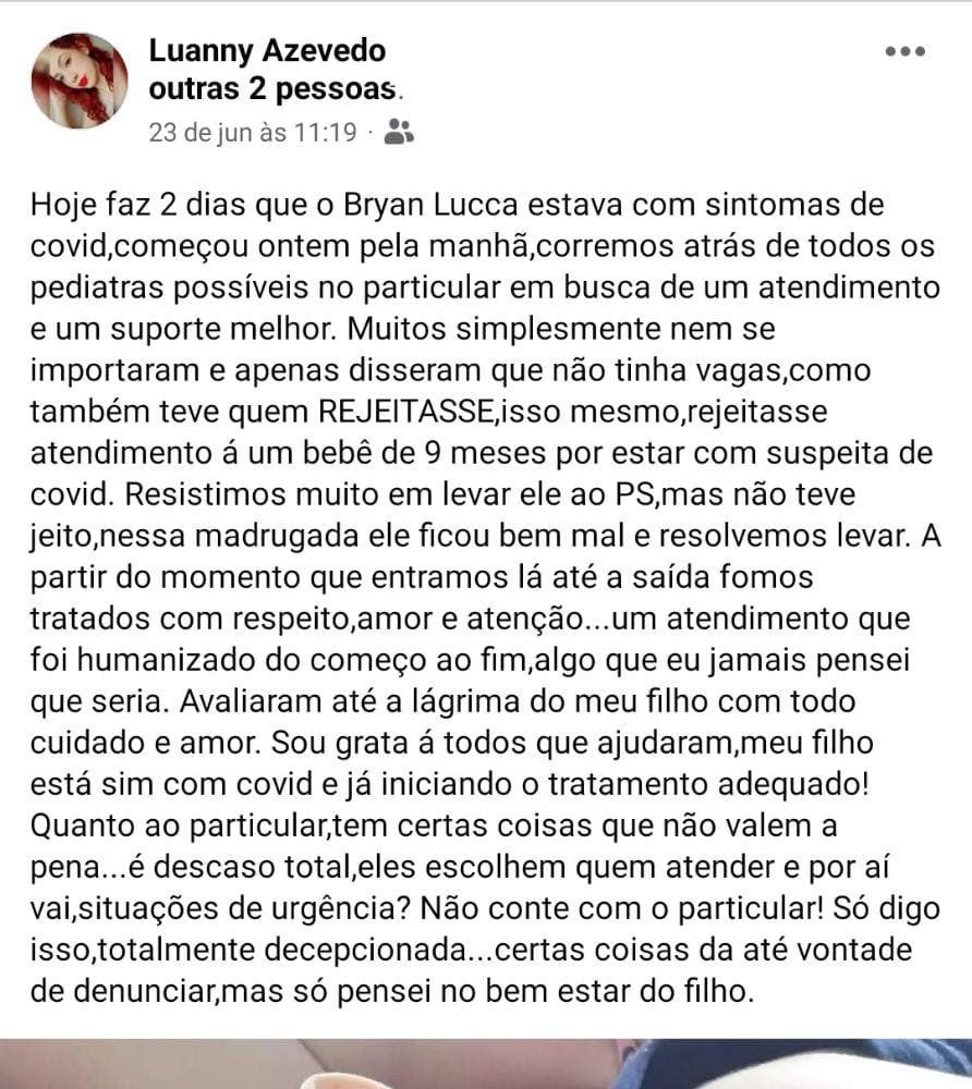 Antes que o relato de Luanny Azevedo, mãe do pequeno Bryan Lucca se tornasse matéria, ela usou as redes socias, no último dia 23 de julho, para relatar que, antes de buscar o atendimento público, havia ido atrás de vários pediatras particulares e não tinha vaga. E que mesmo com a resistência foi ao PS “a partir do momento que entramos lá até a saída fomos tratados com respeito, amor e atenção…um atendimento que foi humanizado do começo ao fim, algo que eu jamais pensei que seria”, escreveu.