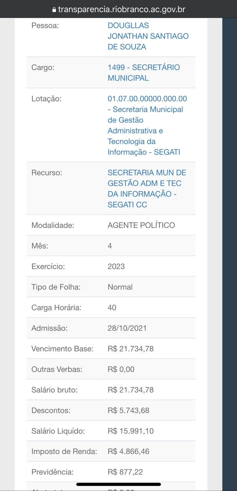 O Na Hora da Notícia foi procurado por uma equipe de servidores da prefeitura que estão participando da greve, iniciada na última quarta-feira, 19, que fizeram questão de mostrar o valor do salário do Secretário Municipal de Gestão Administrativa (Segati), Douglas Jonathan Santiago de Souza.