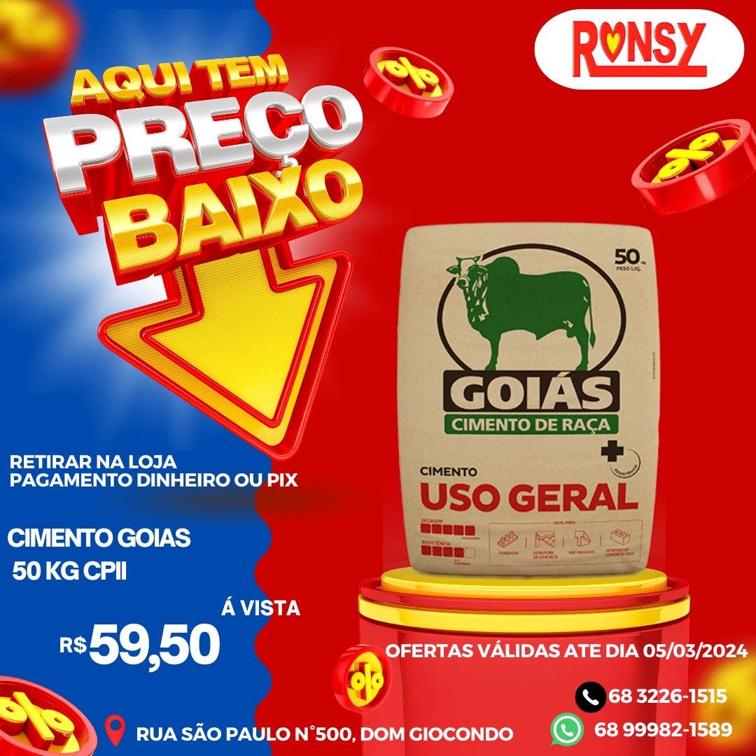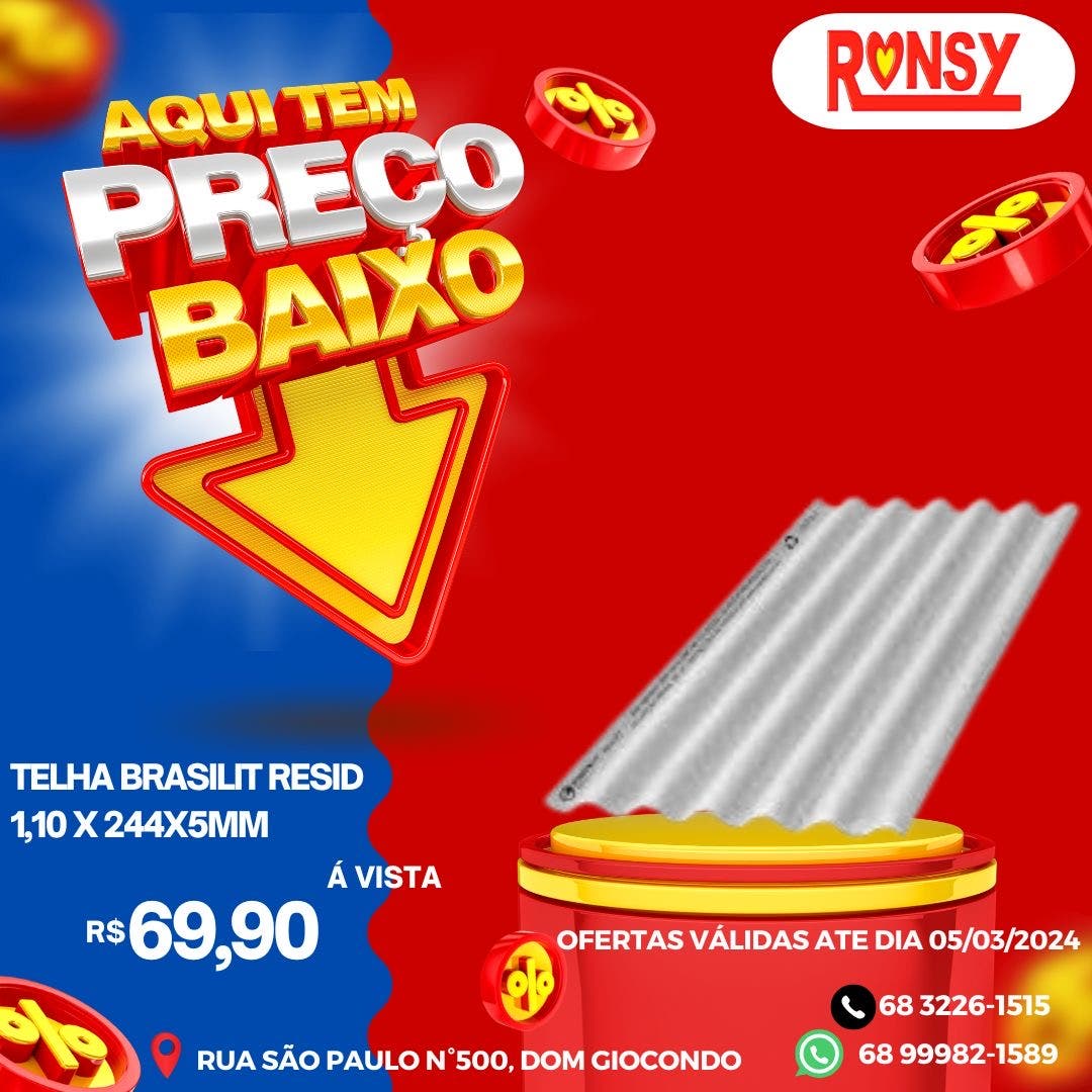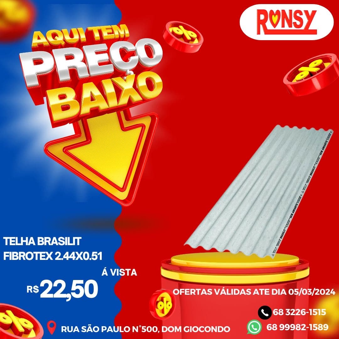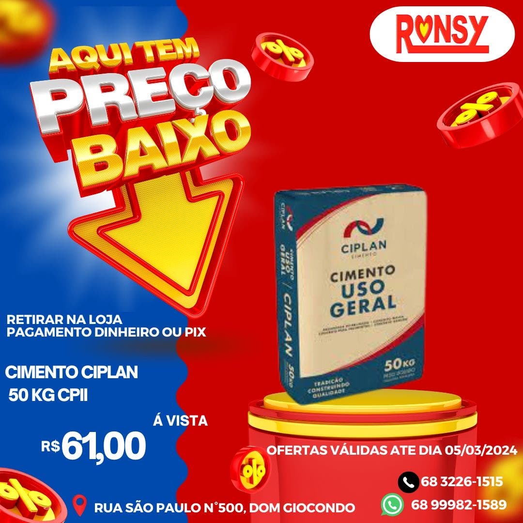 A Ronsy Materiais de Construção está com uma mega oferta de preços baixos para você iniciar ou concluir aquela obra. Não perca a oportunidade e corre até a loja para conferir onde tem os menores preços da cidade.
