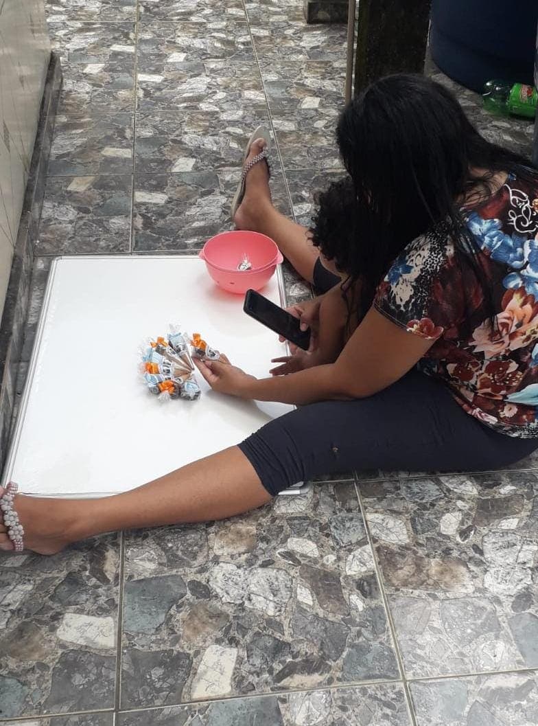 Depois de investir nos cones de chocolate e nos suspiros, foi a vez de acrescentar, no seu trabalho, o algodão doce, outro desafio para Aryana, mas que com dedicação ela conseguiu desenvolver prática e habilidade. Ela conta ainda com a ajuda de toda a família como rede de apoio para cuidar dos filhos, Ana Luísa, 2 anos e 6 meses, e Arthur Miguel, 2 meses, enquanto ela trabalha.