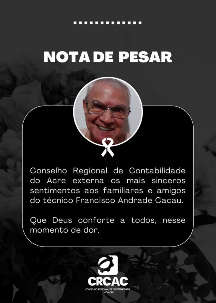 “Conselho Regional de Contabilidade do Acre externa os mais sinceros sentimentos aos familiares e amigos do técnico Francisco Andrade Cacau. Que Deus conforte a todos, nesse momento de dor”, lamentou o conselho.
