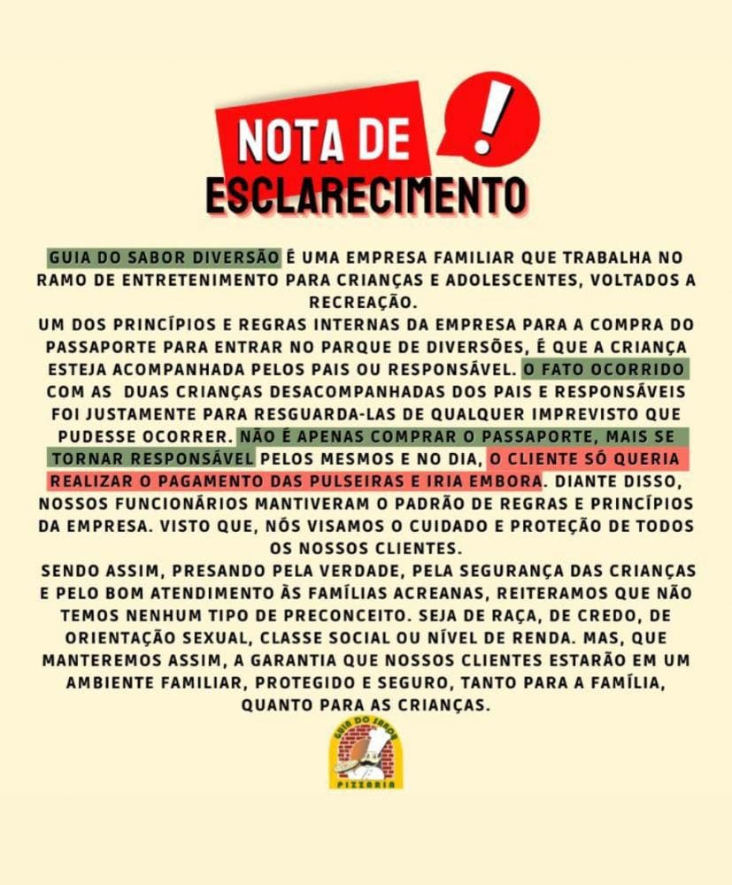 O estabelecimento em questão é o restaurante Guia do Sabor Diversão e emitiu uma nota que o fato com as crianças se deu por estarem desacompanhadas e o objetivo foi assegurá-las. A reportagem tentou conversar com o dono do local, que se limitou a dizer que emitiria a nota. Veja: