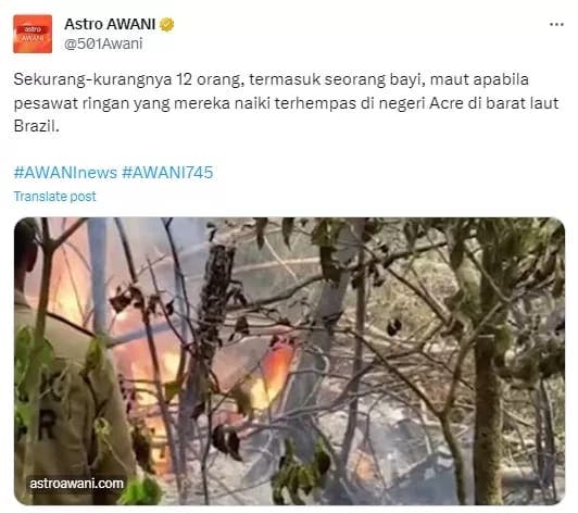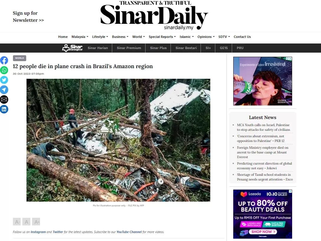 A queda trágica do avião Cessna 208B em Rio Branco, no Acre, no último domingo, 29, continua a gerar repercussão mundial. Diversos jornais ao redor do globo, como Malásia, EUA, Peru, Índia e outros países, têm dado destaque à tragédia que resultou na morte dos 12 ocupantes da aeronave de matrícula PT-MEE, que estava a caminho de Envira, no Amazonas.