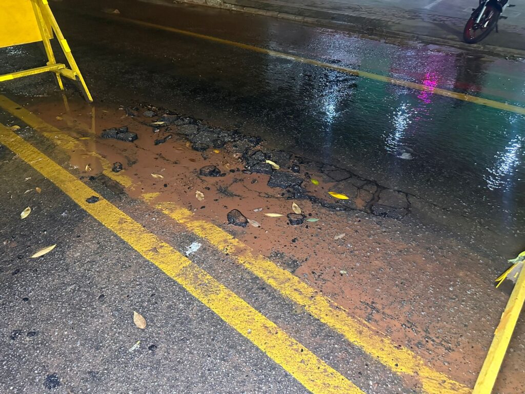 “Difícil essa situação. Não é possível que o dia inteiro não tinha uma equipe de plantão pra vir arrumar isso. Além de prejudicar a gente, a rua está descascando toda”, diz a moradora que prefere não se identificar.