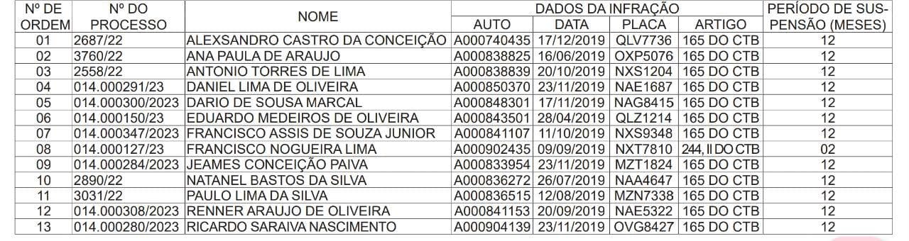 A presidente do Departamento Estadual de Trânsito do Acre (Detran/AC), Taynara Martins Barbosa, no uso de suas atribuições, e considerando o que consta nos autos do processo que tramitou junto à Divisão de Suspensão e Cassação, suspendeu o direito de dirigir de 13 condutores.