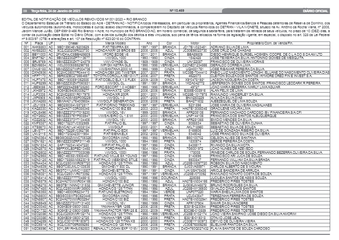 “O Detran notifica todos interessados, em particular os proprietários, agentes financeiros/Bancos e pessoas detentoras de Reserva de Domínio, dos veículos automotores (automóveis, motocicletas e outros) abaixo discriminados, a comparecerem no Depósito de Veículos Removidos do DETRAN – VILA IVONETE, situado na Av. Antônio da Rocha Viana, n° 2005, Jardim Manoel Julião, CEP 69918-466 Rio Branco – Acre, no município de Rio Branco-AC, em horário comercial, de segunda a sexta-feira, para tratarem da retirada de seus veículos, no prazo de 10 (dez) dias, a contar da publicação deste Edital no Diário Oficial, com a devida quitação dos débitos a eles vinculados, sob pena de tê-los leiloados na forma da legislação vigente”, diz um trecho do decreto.