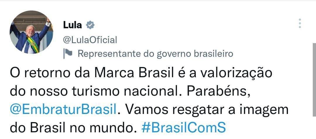 Nas redes sociais, o presidente Luiz Inácio Lula da Silva, disse que “o retorno da Marca Brasil é a valorização do nosso turismo nacional. Parabéns, @EmbraturBrasil. Vamos resgatar a imagem do Brasil no mundo”.