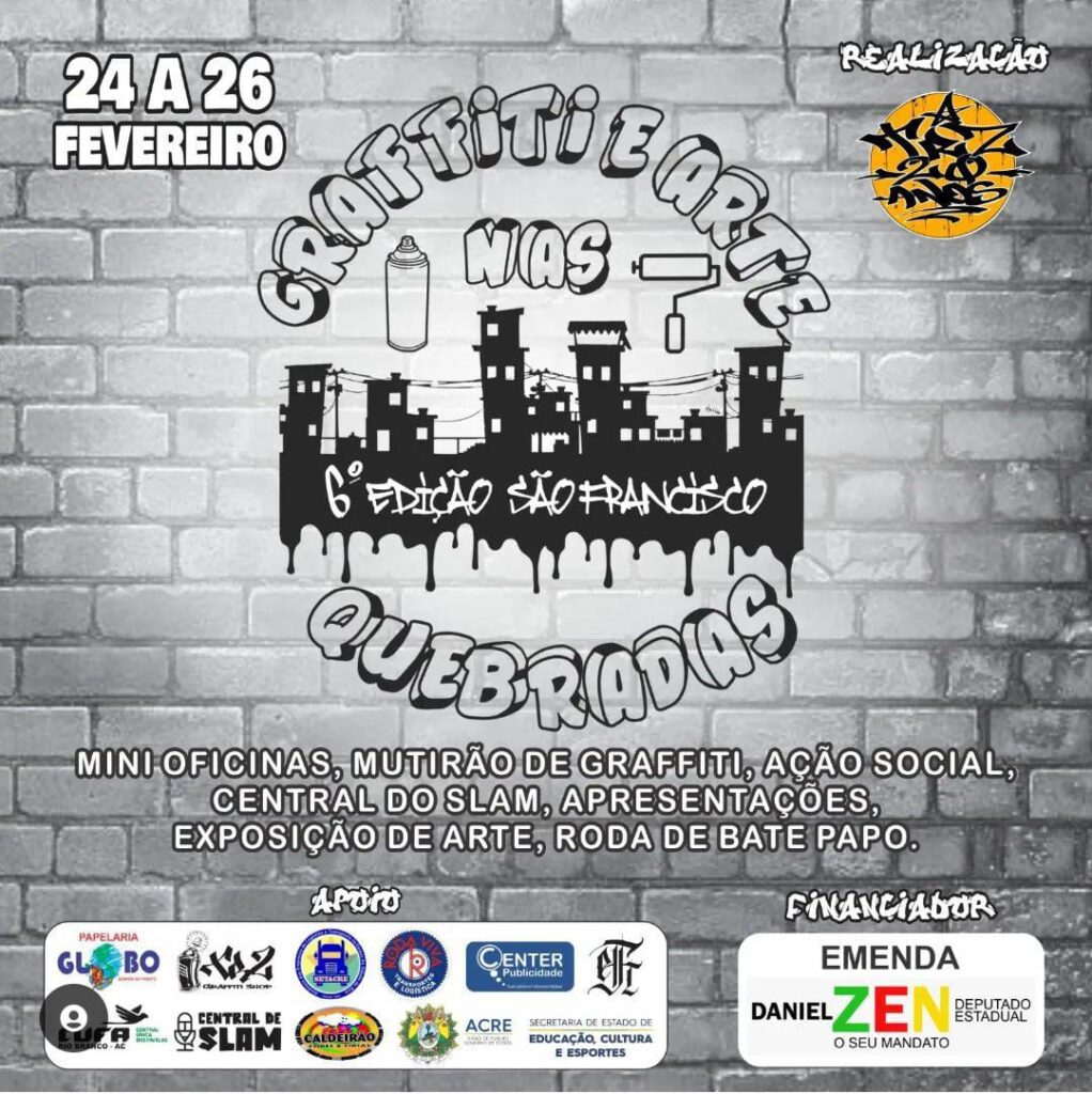 Para comemorar os 20 anos de trabalhos desenvolvidos no Acre, o grupo Trz Crew realizará uma oficina de grafite no bairro São Francisco, parte alta de Rio Branco (AC), entre os dias 24 e 26 de fevereiro, o “6º Graffiti e Arte nas Quebradas”.