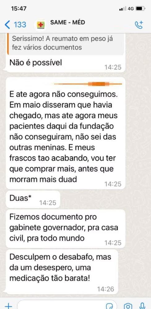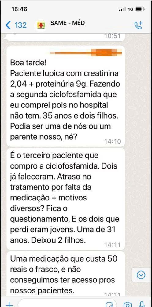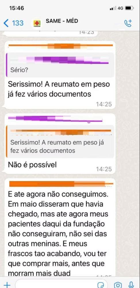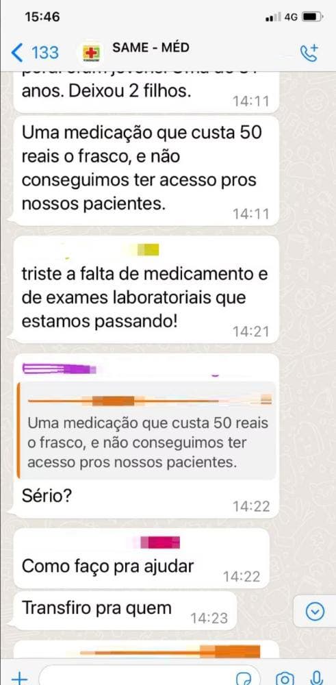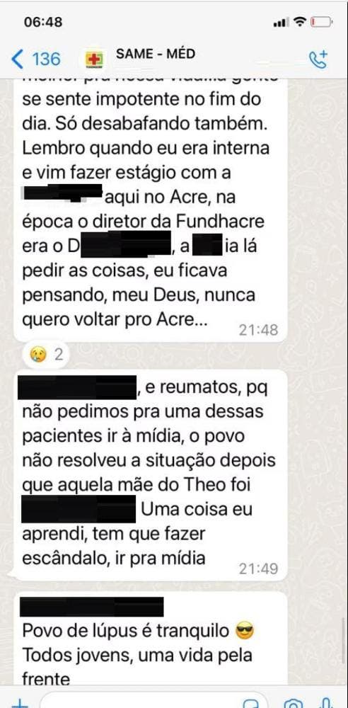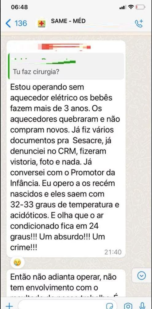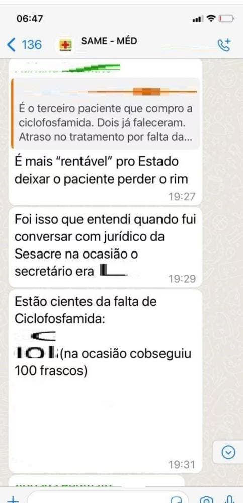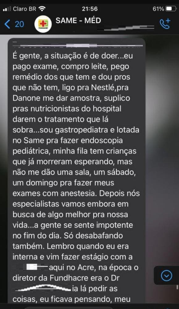 O Sindicato dos Médicos do Acre (Sindmed-Ac) recebeu prints de um grupo denominado de ‘Same’, ligado a servidores da saúde, relatando a falta de medicação e materiais de uso hospitalar na Fundação Hospital Estadual do Acre. (Veja abaixo)