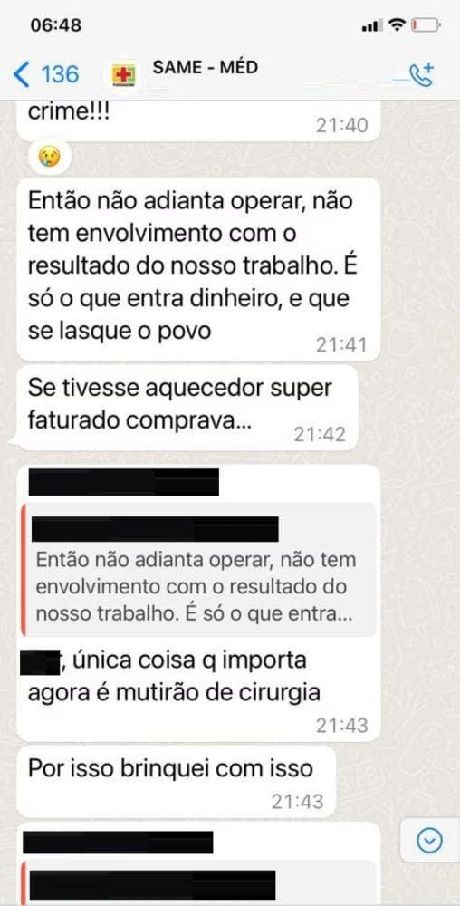Nas relatos postados no grupo, entre várias reclamações da atual gestão uma delas é que não dá atenção a unidade e que até vaquinha já foi realizada por médicos para compra de medicação. Além disso, nas denúncias alegam que até cirurgias eletivas são canceladas para que seja feito o mutirão. E também chamam atenção para o risco de morte por falta de medicação e materiais para um trabalho adequado.