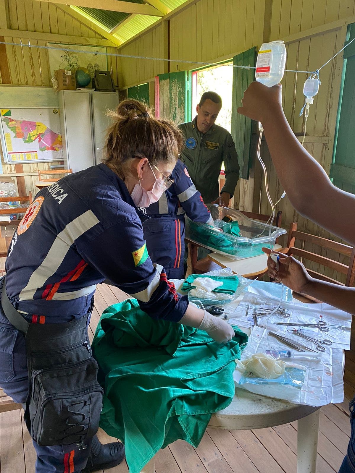 Logo após a chegada, a médica e a enfermeira do Samu fizeram alguns procedimentos padrões de assepsia nas crianças e na mãe, antes de decolarem de volta a Rio Branco, desta vez com os novos passageiros.