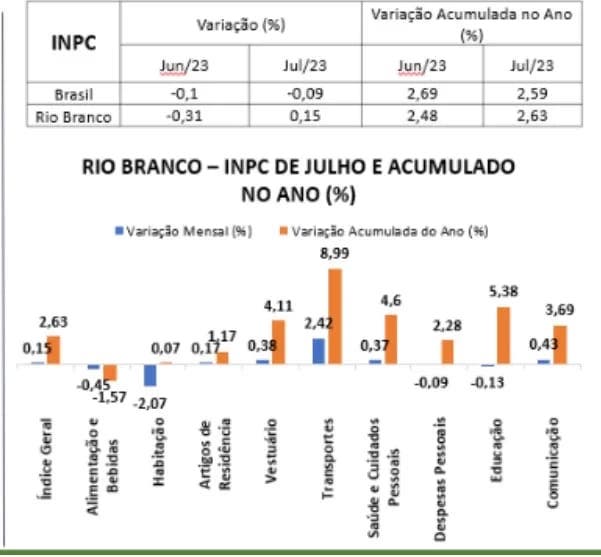 O Índice Nacional de Preços ao Consumidor (INPC) de e julho foi de 0,15% e ficou 0,46 ponto percentual abaixo da taxa de junho, que ficou em -0,31. Em 1 ano, o INPC acumulou uma alta de 3,75%, acima dos 3,53% observados no país. Em julho do ano passado, essa variação na capital havia sido de -1,07%.