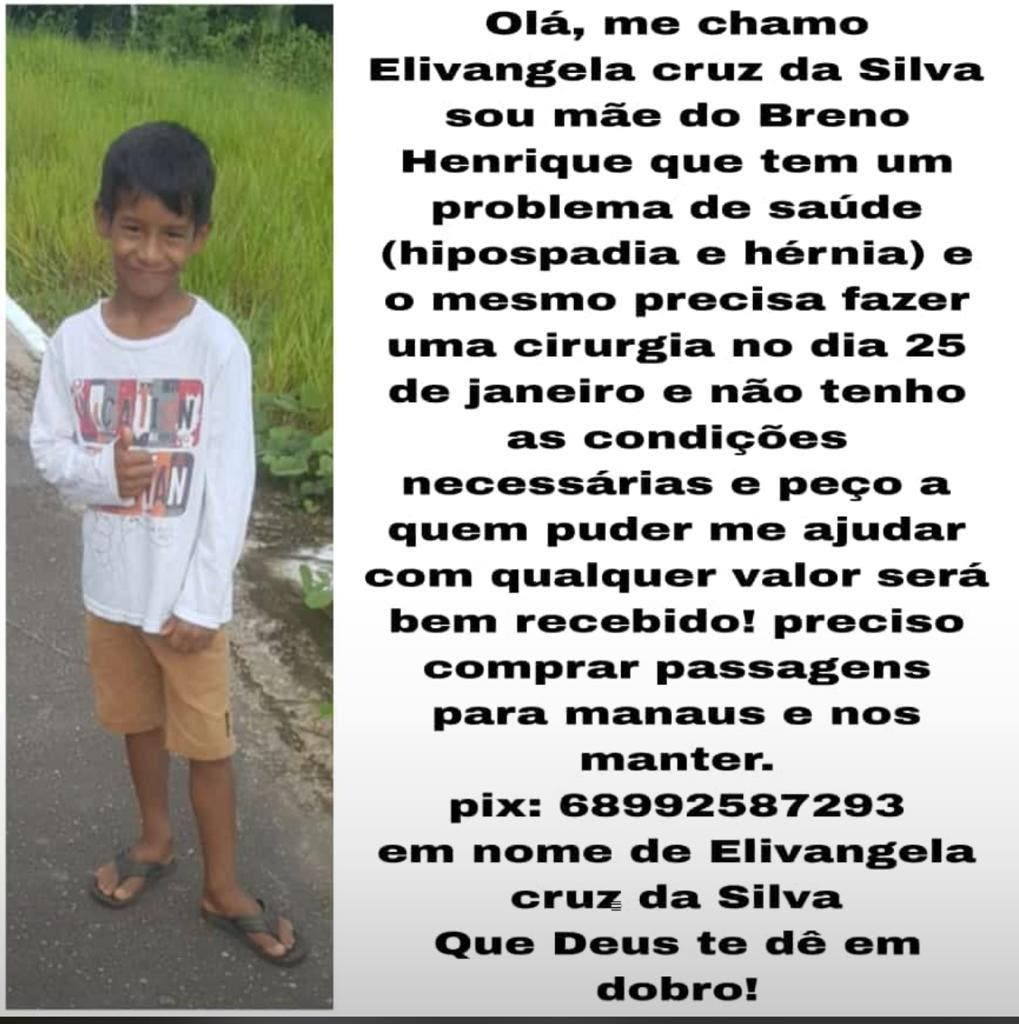 A mãe do pequeno Breno Henrique Silva do Amaral, de oito anos, a senhora Elivangela Cruz da Silva, 25 anos, moradora de Cruzeiro do Sul (AC), está pedindo ajuda para levar o filho para Manaus (AM) onde passará por avaliação e cirurgia de hipospádia e hérnia que aguarda há quase quatro anos pelo Sistema Único de Saúde (SUS).