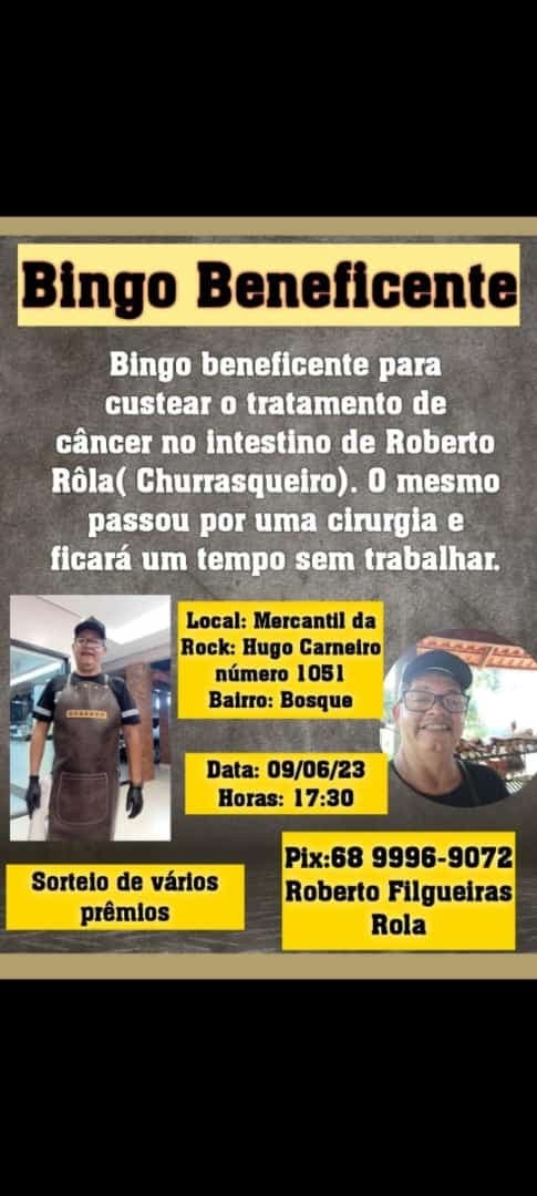 A família do churrasqueiro Roberto Filgueiras Rola, 60 anos, conhecido pelo seu famoso churrasco do Rola, estará realizando na próxima sexta-feira, 9 de junho, às 17h30, no Mercantil da Rock, localizado na rua Hugo Carneiro, nº 1051, bairro Bosque, Rio Branco (AC), um bingo beneficente para ajustar nas despesas pós-operatória.
