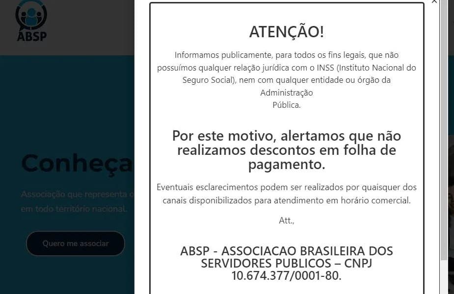 Os golpistas estão utilizando diversas entidades para aplicar o golpe, sendo a Associação Brasileira dos Servidores Públicos (ABSP) uma das mais utilizadas. No entanto, ao acessar o site dessa instituição, é possível encontrar um alerta público informando que não possuem qualquer relação com o INSS ou órgãos da Administração Pública, e que não realizam descontos em folha de pagamento.