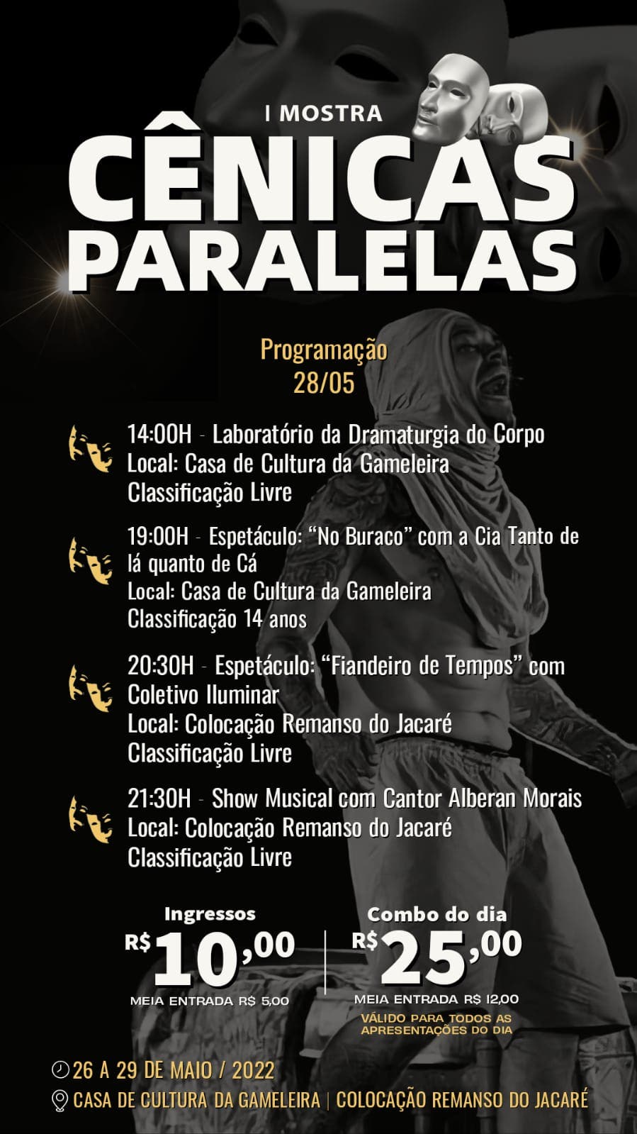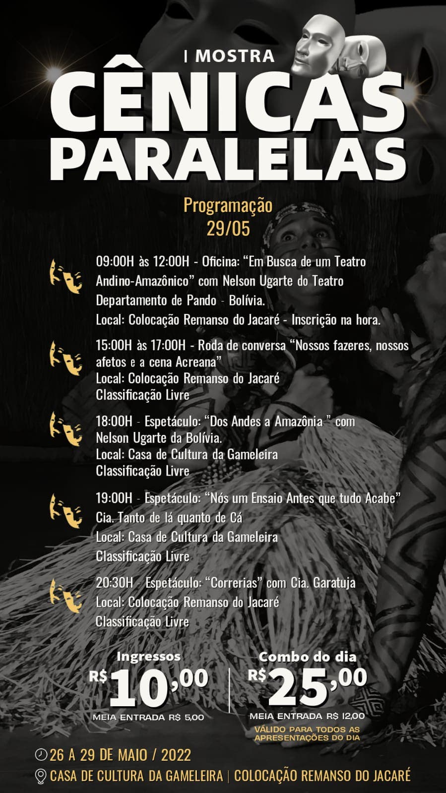 A I Mostra Cênicas Paralelas acontece entre os dias 26 e 29 de maio, na Casa de Cultura da Gameleira, Colocação Remanso do Jacaré, localizado na região do Segundo Distrito de Rio Branco (AC).