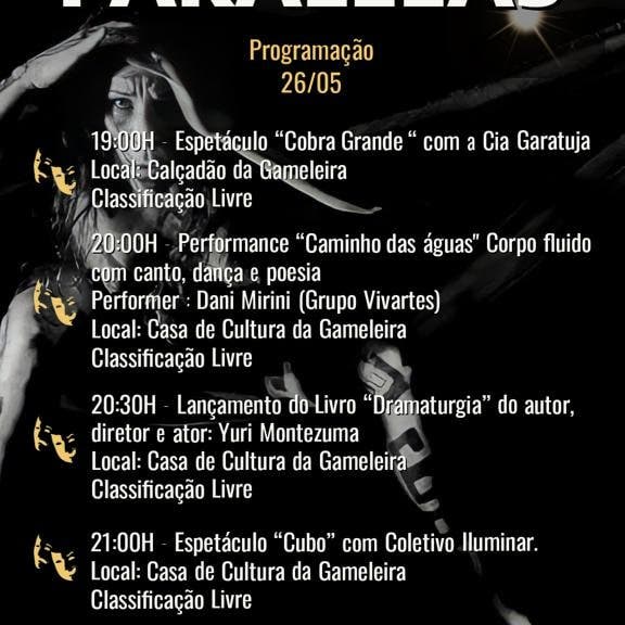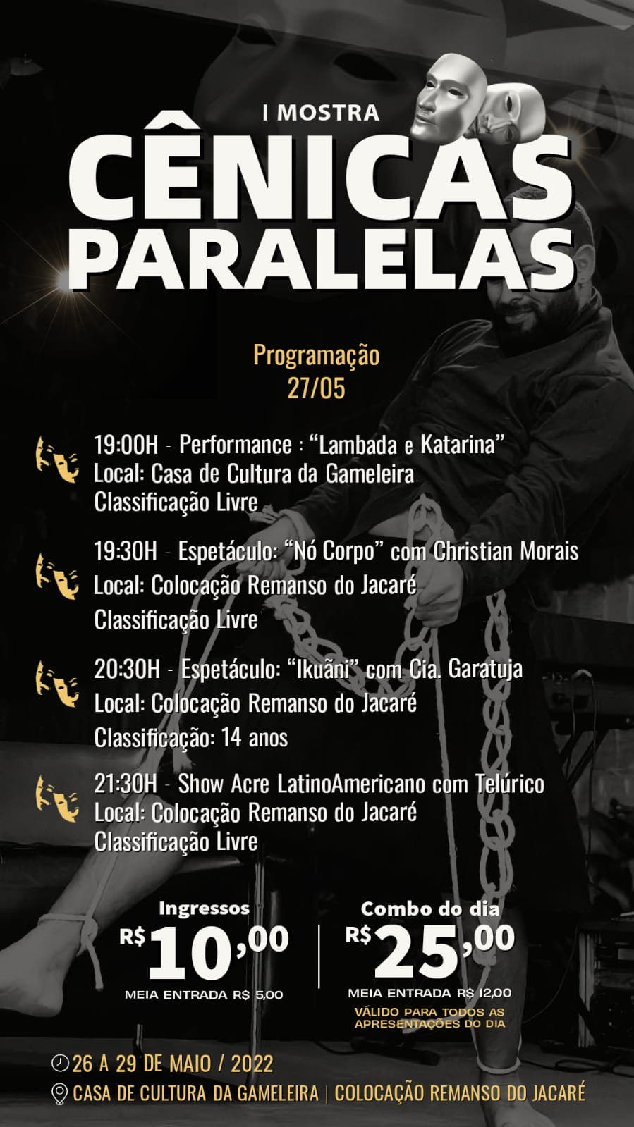 A I Mostra Cênicas Paralelas acontece entre os dias 26 e 29 de maio, na Casa de Cultura da Gameleira, Colocação Remanso do Jacaré, localizado na região do Segundo Distrito de Rio Branco (AC).