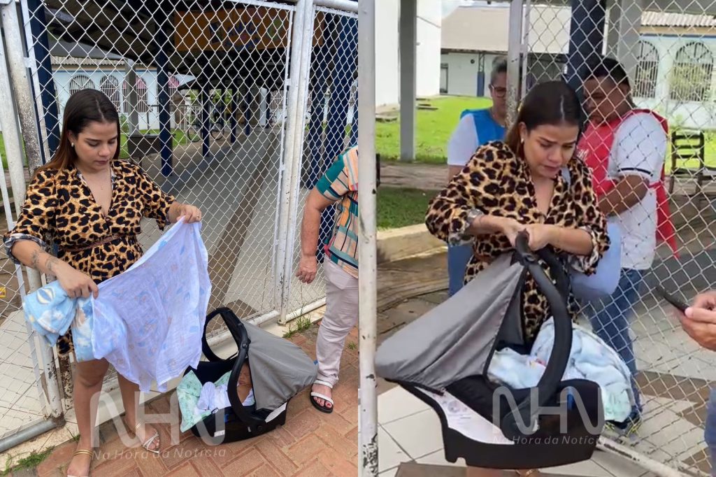 A jovem mãe não desistiu do sonho do concurso e, mesmo com seu bebê no colo e com o apoio do marido e com um bebê conforto, foi para a escola realizar a prova.