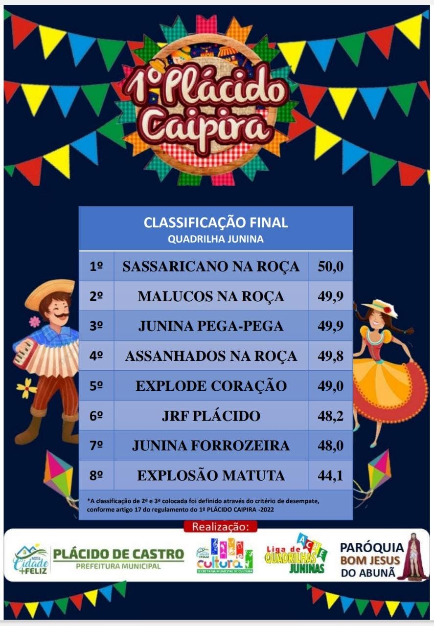 A quadrilha Junina Sassaricano na Roça foi a grande campeã do 1º Plácido Caipira, que ocorreu neste último fim de semana, no município de Plácido de Castro (AC) de uma parceria da prefeitura local com a Liga de Quadrilhas Juninas do Acre (Liquajac).