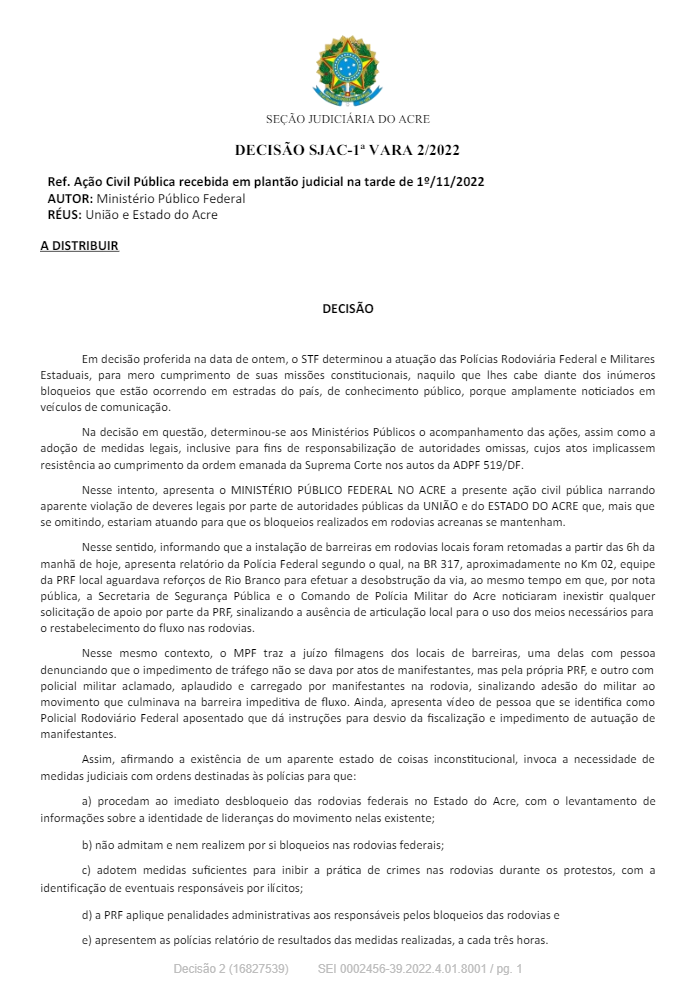 A JF determinou, ainda , que a Polícia Rodoviária Federal e a Polícia Militar do Estado do Acre demonstrem efetiva atuação desde antes desta ordem judicial, no cumprimento de seus deveres de ofício, mediante a apresentação, no prazo de 24 horas, de relatório das medidas que adotaram até esta decisão para a efetiva retirada de pessoas, veículos e/ou objetos que estavam obstruindo o regular tráfego nas rodovias federais no Estado do Acre, informando o quantitativo de pessoal mobilizado nas operações, os planos para retomada dos locais e os motivos pelos quais não obtiveram êxito na retomada do fluxo das rodovias federais até este momento.