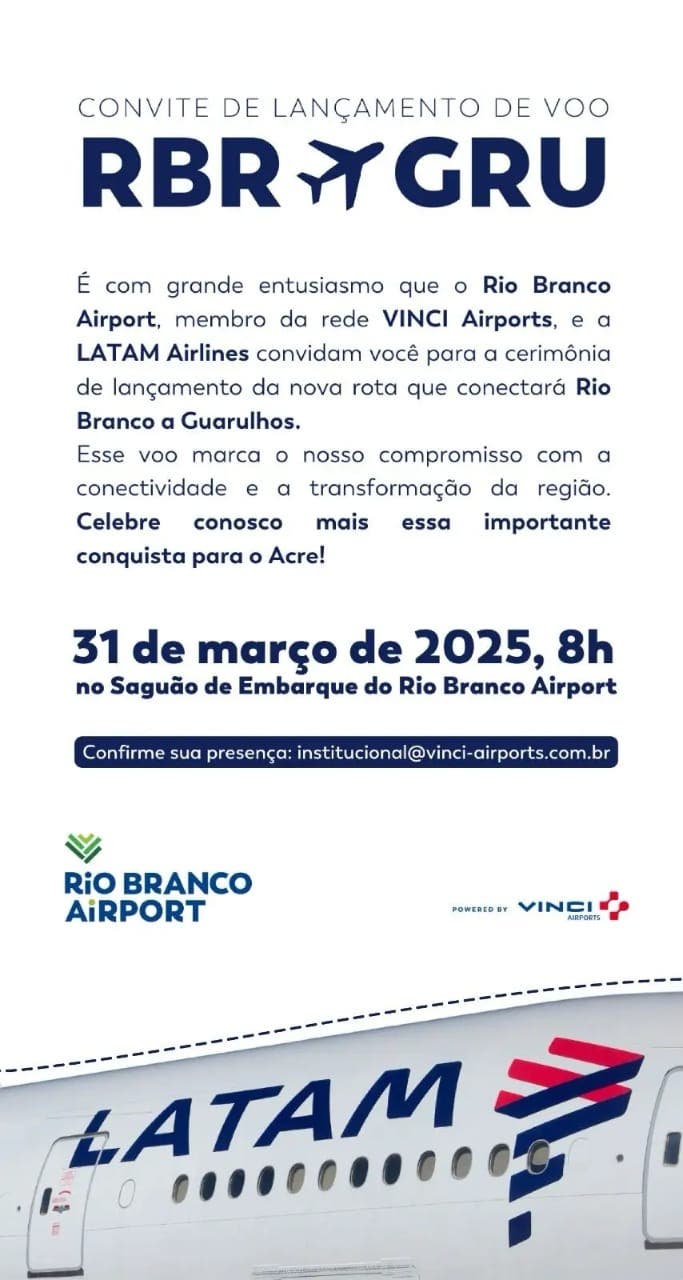 A Latam retoma seus voos diretos entre Rio Branco e São Paulo (Guarulhos) na próxima segunda-feira (31), marcando um importante avanço na conectividade aérea do Acre. A cerimônia de reinauguração da rota, que acontecerá às 8h (horário local) no Aeroporto Internacional Plácido de Castro, contará com a presença de autoridades, representantes da Latam e da Concessionária dos Aeroportos da Amazônia (VINCI Airports).