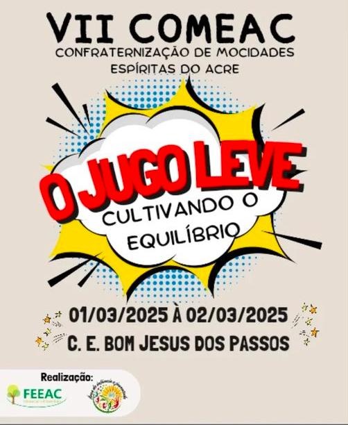Prepare-se para um fim de semana de aprendizado, conexão e muita diversão! A Federação Espírita do Acre convida você, jovem espírita de 12 a 21 anos, para a VII Confraternização de Mocidades Espíritas do Acre, que acontecerá nos dias 1 e 2 de março no Centro Espírita Bom Jesus dos Passos.