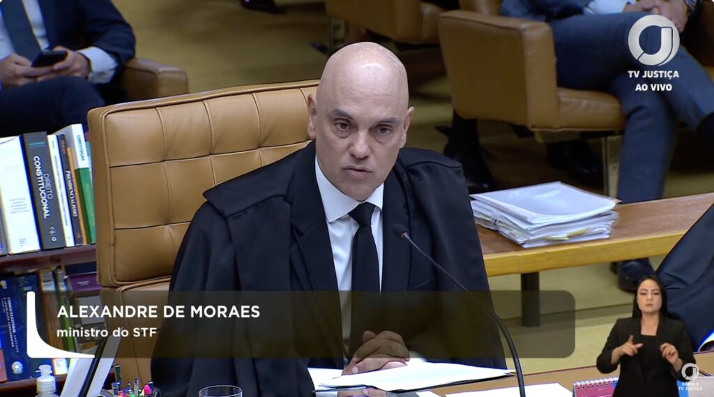 Moraes falou que a forma de aplicação do tarifaço de Donald Trump, presidente dos Estados Unidos, é a mesma da trama golpista. “O modus operandi golpista é o mesmo”, começou.