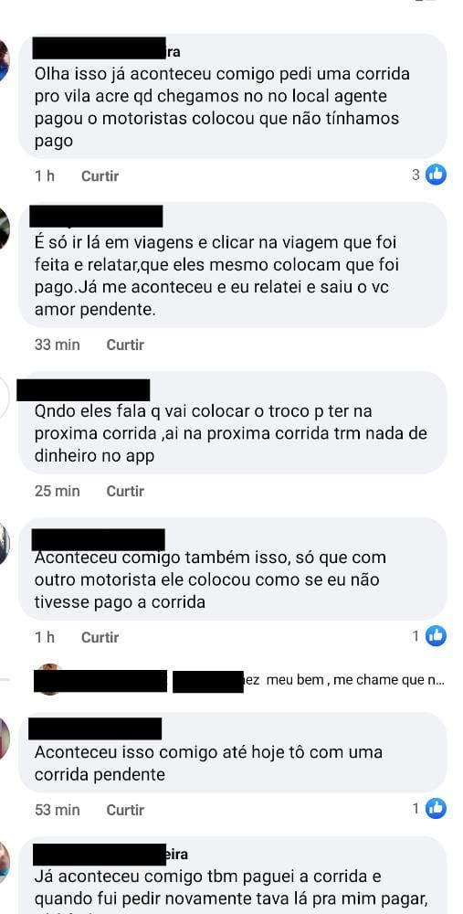 Quando um motorista relata o não recebimento, o aplicativo deixa como se o passageiro tivesse uma corrida não paga e ele tem que pagar para efetuar outra. Na postagem, outros internautas relataram situações semelhantes.