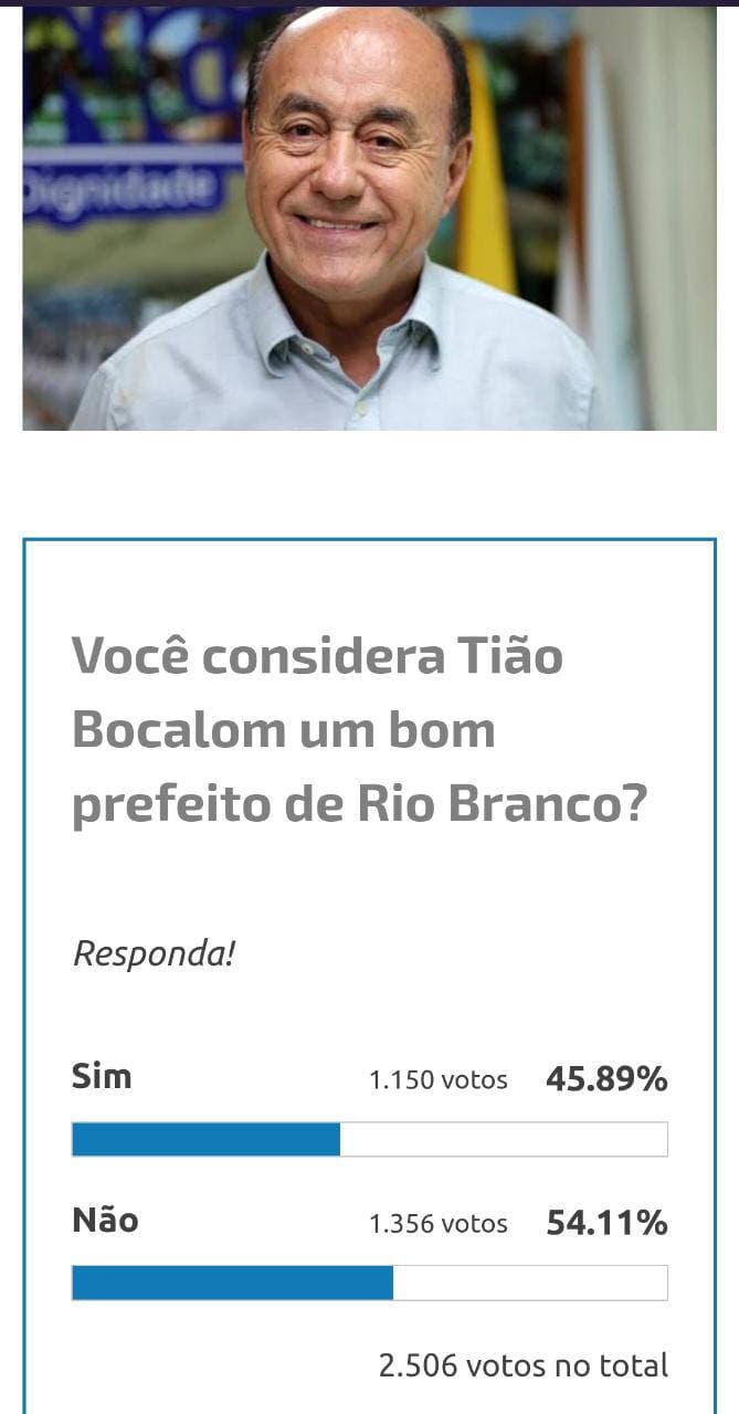 Uma pesquisa informal realizada pelo OCN Brasil News aponta que 54,11% dos votos reprovam a gestão do atual prefeito de Rio Branco (AC), Tião Bocalom do Partido Progressistas (PP).