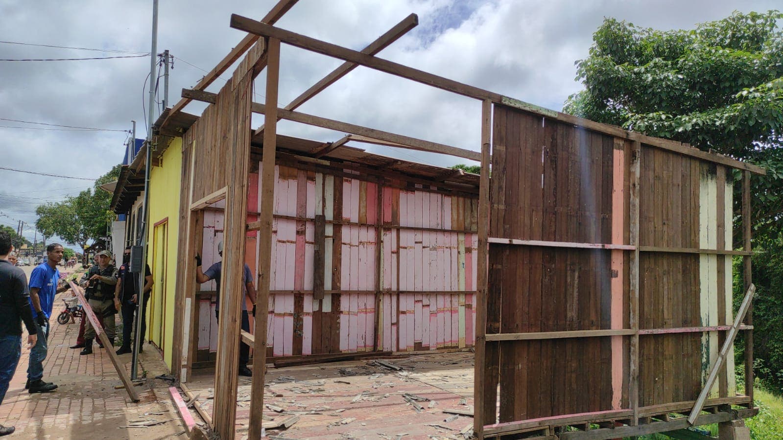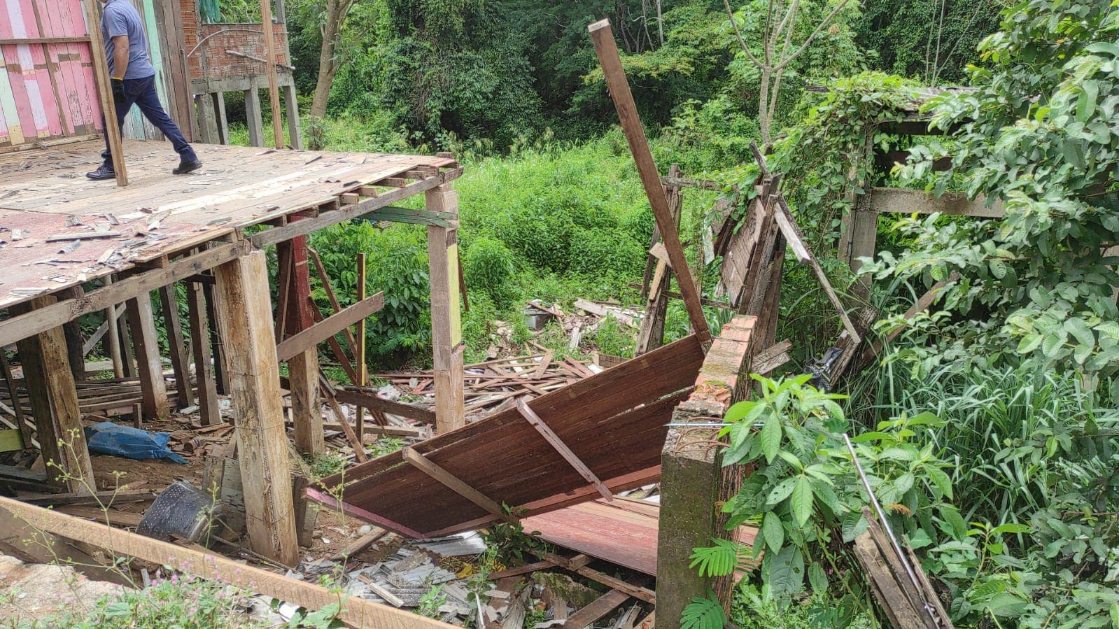 A equipe de reportagem acompanhou o trabalho dos fiscais, que desmontaram uma parte da casa, e outra jogaram em um barraco que fica embaixo da residência.