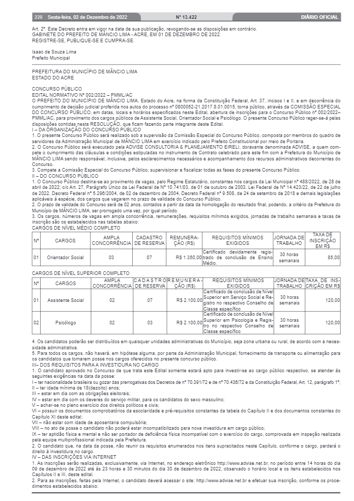 Após decisão judicial, a Prefeitura de Mâncio Lima, divulgou a realização de um concurso público para provimento de vagas e cadastro reserva em cargos públicos de níveis médio e superior para profissionais da saúde.