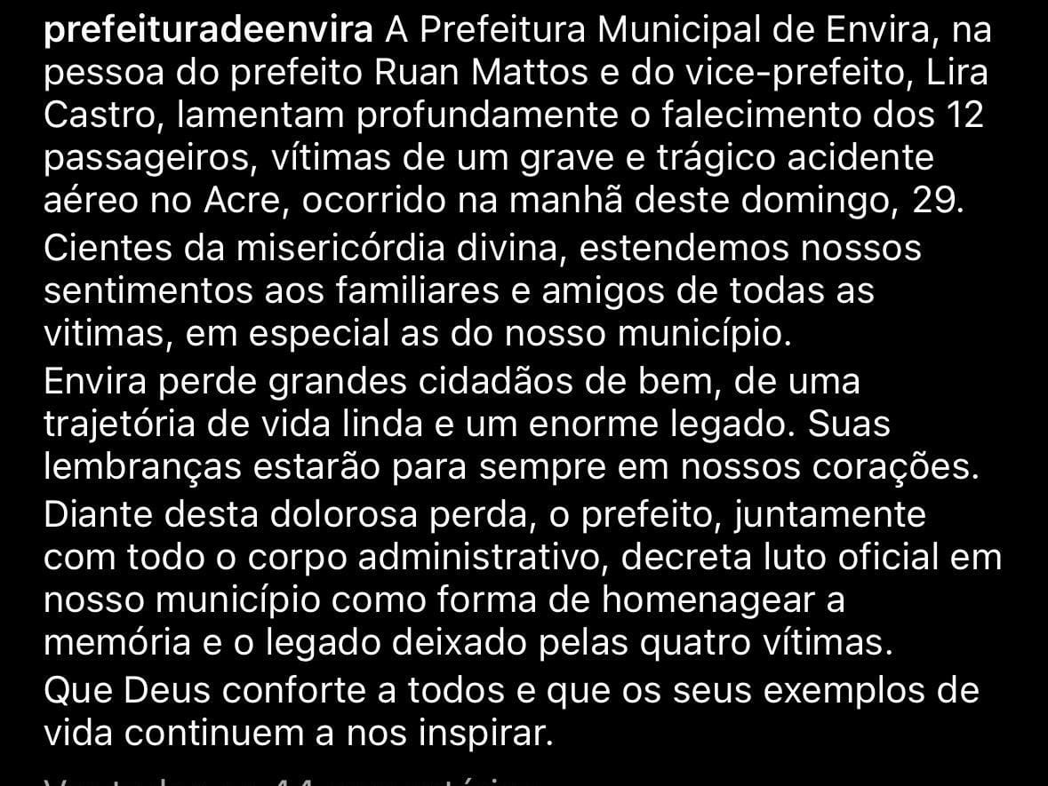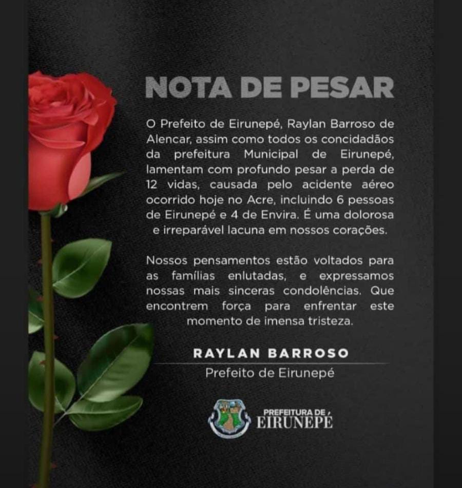 Os prefeitos Raylan Barroso (Eirunepé), e Ruan Mattos (Envira), emitiram notas de pesar lamentando o ocorrido, veja abaixo:
