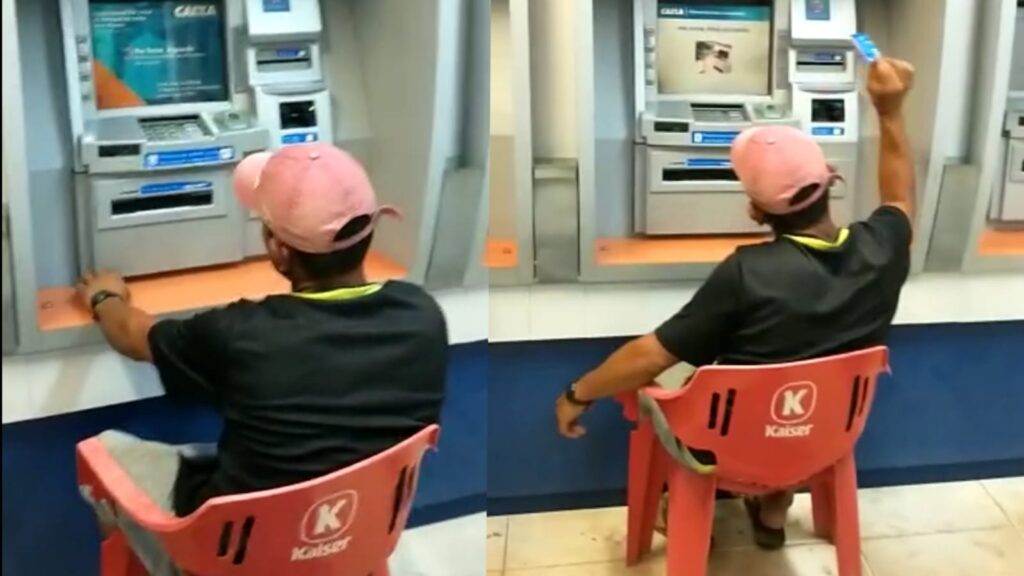 No vídeo, aparece um homem que resolveu, literalmente, aguardar sentado até que os profissionais da Caixa resolvam o problema de falta de dinheiro.