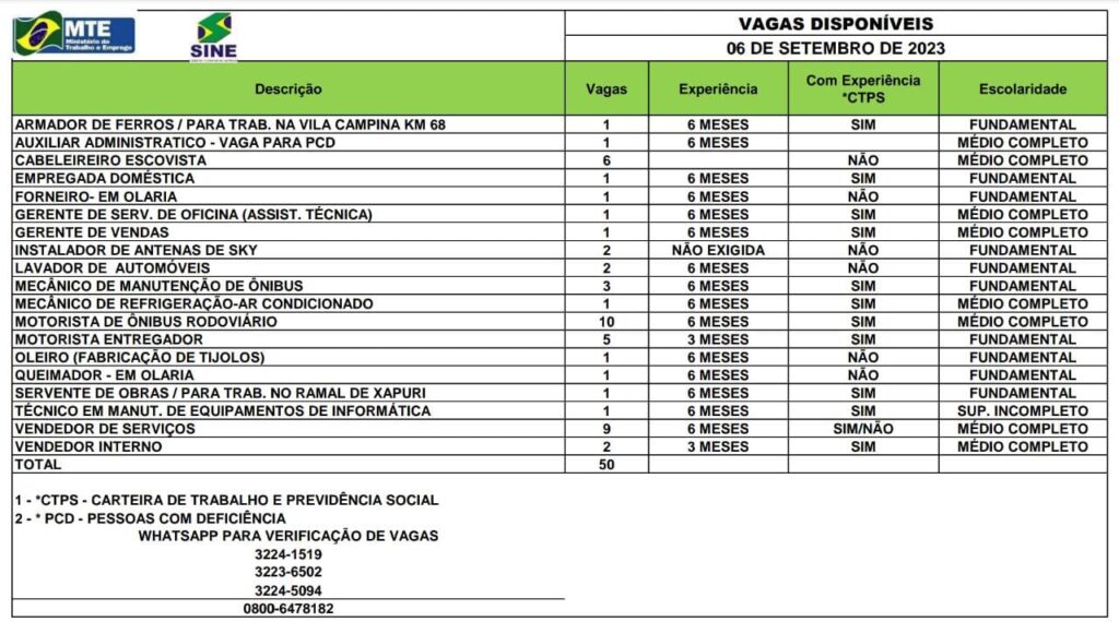 O Sistema Nacional de Emprego do Acre (Sine) está ofertando 50 vagas de emprego para esta quarta-feira, 6. Dessas, 18 são para quem possui nível fundamental, 31 para nível médio e uma vaga para quem possui nível superior incompleto.