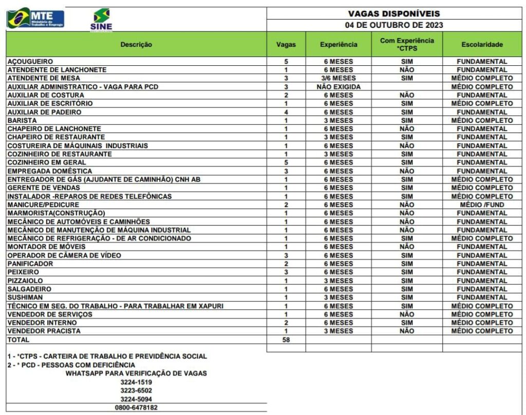 O Sistema Nacional de Emprego do Acre (Sine), está ofertando 58 vagas de emprego para Rio Branco e Xapuri (AC) nesta quarta-feira, 4. Dessas, 39 são para quem possui nível fundamental, 17 para nível médio e 2 para quem tem fundamental/médio.