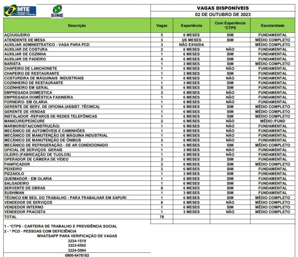 O Sistema Nacional de Emprego do Acre (Sine), está ofertando 78 vagas de emprego para Rio Branco e Xapuri (AC) nesta segunda-feira, 2. Dessas, 53 são para quem possui nível fundamental, 33 para nível médio e 2 para quem tem fundamental/médio.