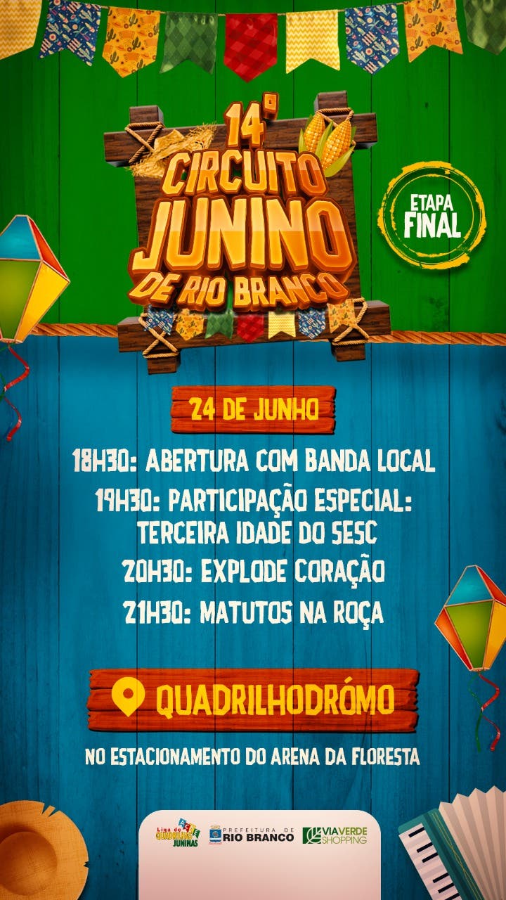 A última etapa do XIV Circuito Junino acontecerá neste fim de semana no Quadrilhódromo, localizado nas proximidades do estacionamento do Estádio Arena da Floresta, região do Segundo Distrito de Rio Branco, a partir das 18h.