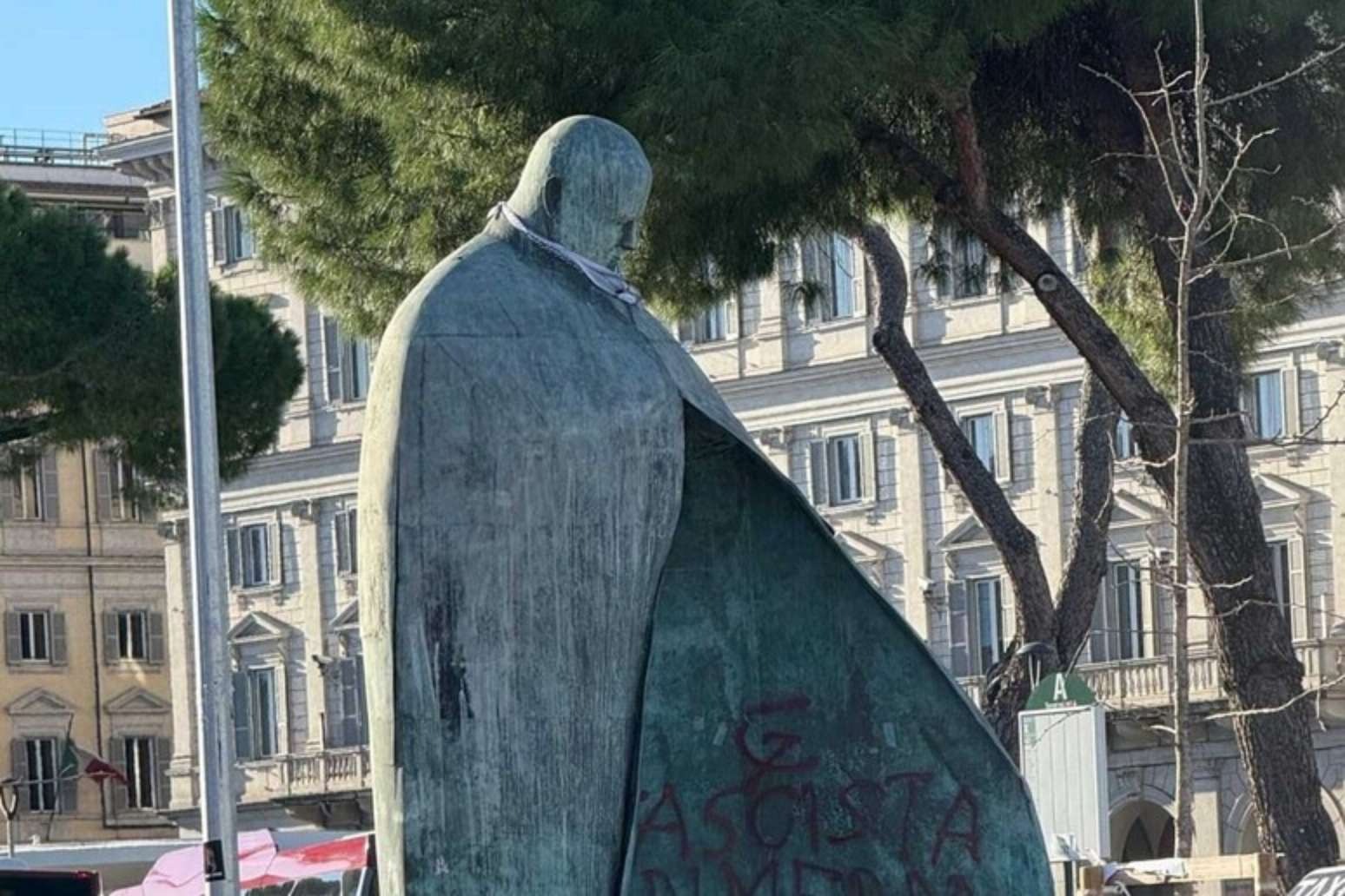 Uma estátua do papa João Paulo II (1920-2005), localizada nas proximidades da estação Termini, em Roma, foi vandalizada neste sábado (4). A ação foi amplamente criticada pelo governo italiano.