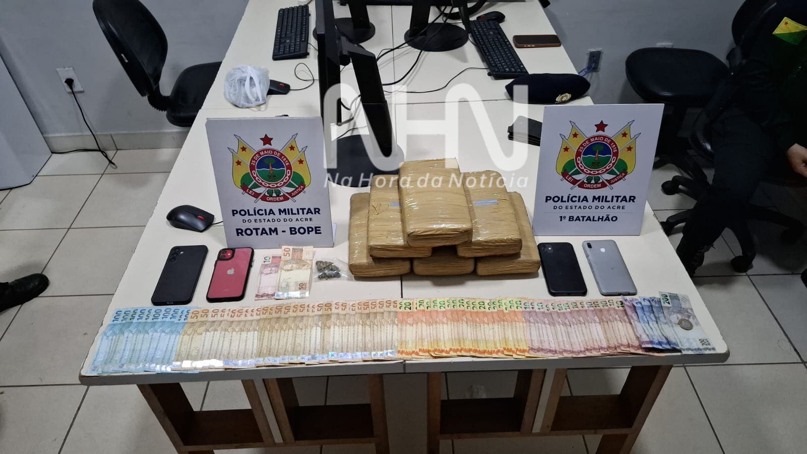Uma ação integrada da Força Tática do 1º Batalhão e da ROTAM Alpha 04, que atuam na Operação RENOE, resultou na apreensão de uma mala com seis barras de maconha e na prisão de três homens na noite desta quarta-feira (19), na Travessa Juricaba, no bairro João Paulo II, na Baixada da Sobral, em Rio Branco.