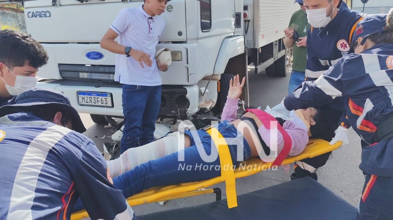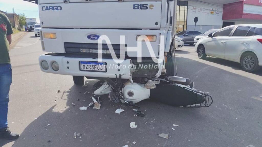 Um acidente de trânsito envolvendo um caminhão e uma motocicleta deixou Jairiane Lima de Oliveira, de 32 anos, ferida, e o filho dela, de 14 anos, com escoriações, na tarde desta sexta-feira (20), no cruzamento das ruas Minas Gerais e Pernambuco, no bairro Dom Giocondo, em Rio Branco.