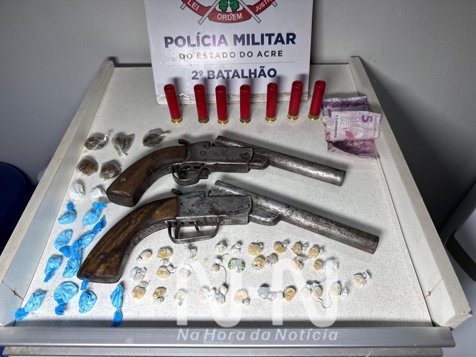 Duas garruchas foram apreendidas, além de sete cartuchos intactos e porções de maconha, cocaína e pedra de crack que estavam com o adolescente.